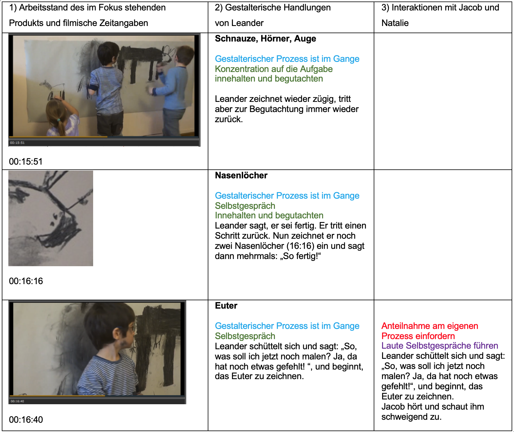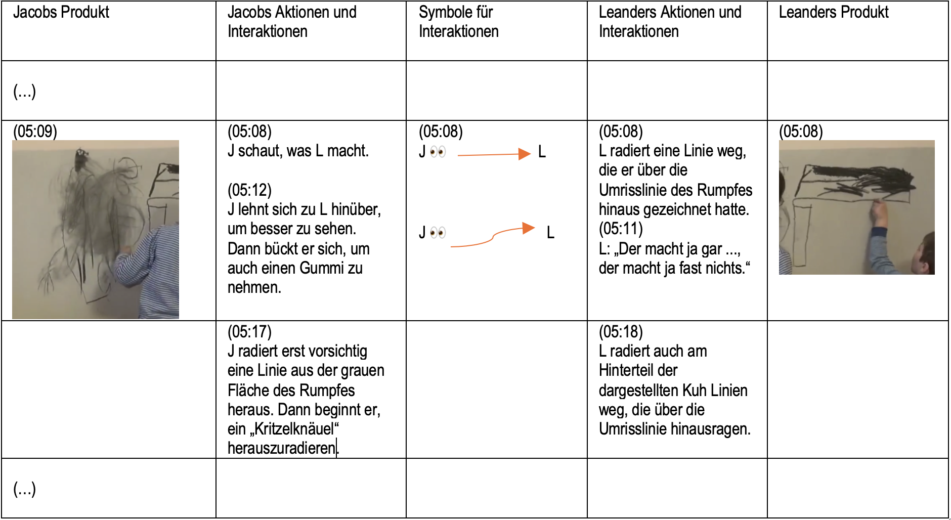 In den Feintranskripten, die in der Phase 2 der Auswertung, der sequenziellen Analyse ausgewählter Videoausschnitte, zum Einsatz kommen, sind Aktionen und Interaktionen mehrerer Kinder an einem Arbeitsplatz sowie der Werdegang der gestalterischen Produkte in parallelen Spalten festgehalten, was wie folgt aussieht: