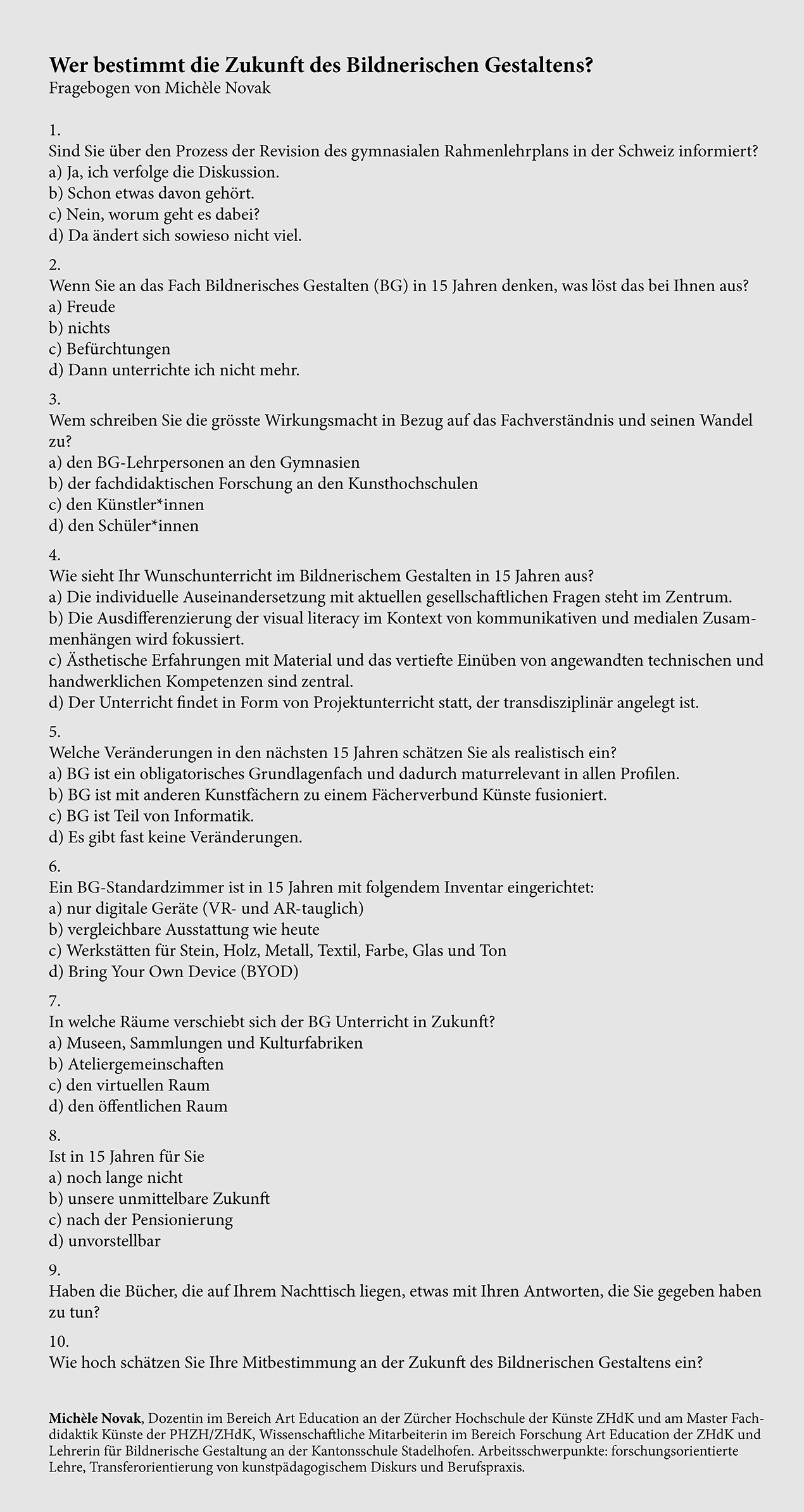 Projekte der Lehrplanrevision, wie aktuell in der Schweiz die Überarbeitung des gymnasialen Rahmenlehrplans 2020-2022, fordern dazu auf, die Inhalte und Ziele der einzelnen Fächer zu überprüfen und bieten Anlass, über das Wissen in einem Fach und dessen Veränderung nachzudenken. Wie lässt sich eine solche Veränderung denken und woran kann sie sich orientieren, wenn sie über den pragmatischen Rahmen eines bildungspolitisch motivierten Revisionsprojektes, das durch knappe zeitliche Ressourcen und akuten Handlungsdruck gekennzeichnet ist, hinausgehen will? Der vorliegende Artikel schliesst an Michel Foucaults Ontologie der Gegenwart an und sucht in daran orientierten bildungsphilosophischen Überlegungen nach einer Perspektive der Veränderung, die sich gleichermassen kritisch wie selbstreflexiv positioniert und die sich nicht an dem ausrichtet, was an grossen Herausforderungen der Zukunft diagnostiziert wird, sondern von dem ausgeht, was bereits da ist und sich im Alltag zeigt. Dabei wird ein Weg eröffnet, das bestehende kunstpädagogische Wissen zu fassen und zu reflektieren. Der Text wird erweitert und fortgesetzt durch eine Fussnote von Margot Zanni und einen Fragebogen von Michèle Novak, die diese Bewegung der (selbst-)kritischen Reflexion bereits in der Lektüre beginnen lassen.