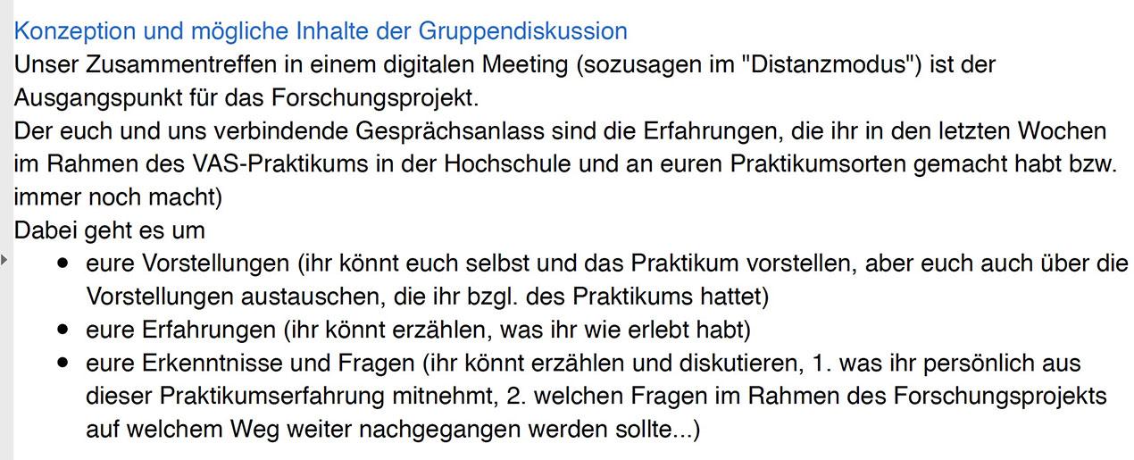 Nach einem kurzen Informationstreffen im Rahmen des Praktikumsbegleitseminars, bei dem Miriam Schmidt-Wetzel sich in ihrer Funktion und mit ihrem grundsätzlichen Forschungsinteresse an den Erfahrungen der Studierenden in ihrem Berufspraktikum vorstellt, melden sich drei Studierende zur Teilnahme an der via Zoom durchgeführten Gruppendiskussion. Sie erhalten vor der Durchführung der Gruppendiskussion schriftliche Informationen zur Klärung des Verfahrens (siehe Abb. 1), die in ähnlich lautender Weise im mündlichen Eingangsimpuls Das Transkript der Gruppendiskussion ist bei den Autorinnen einsehbar. der Forscherin als Moderatorin zu Beginn der Gruppendiskussion wiederholt werden.