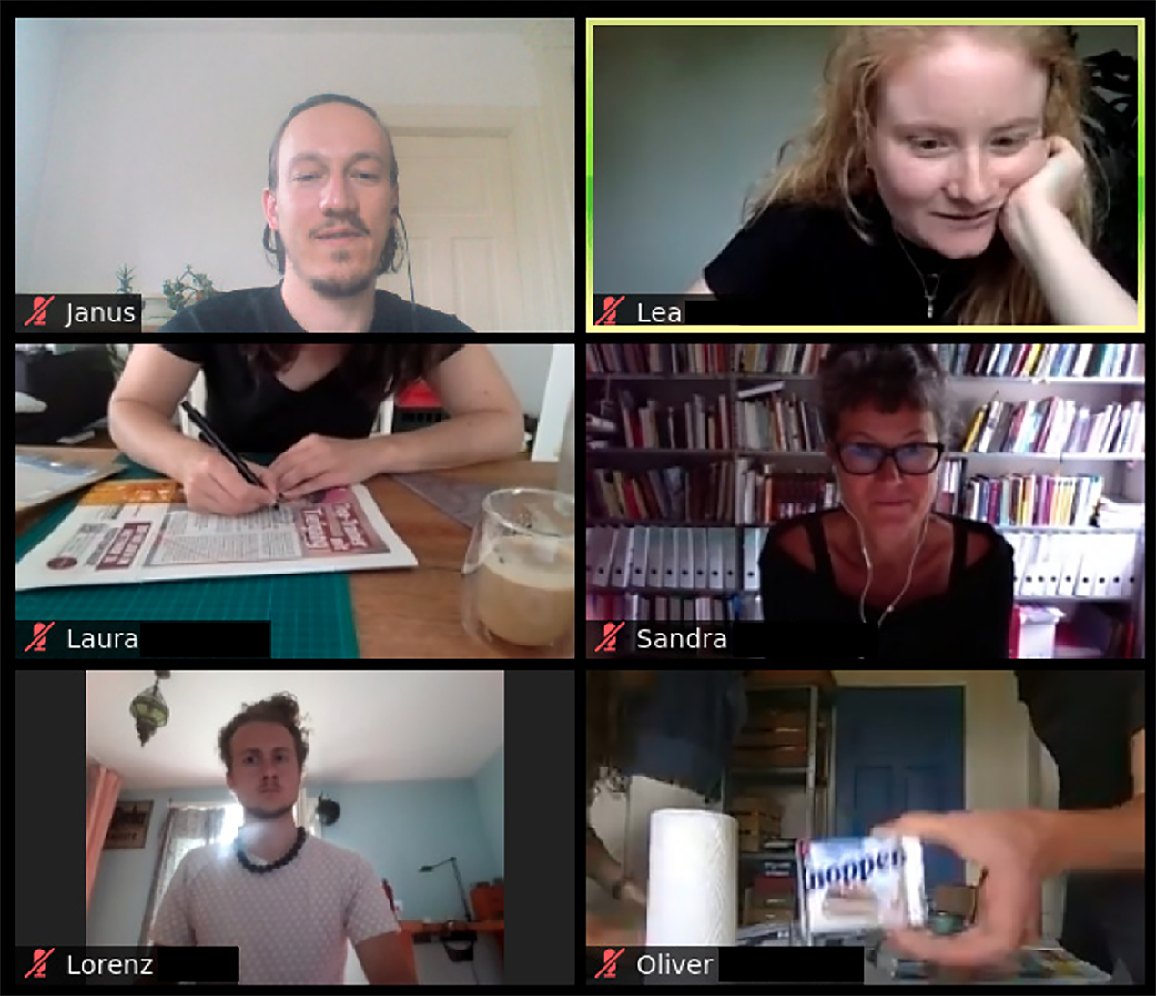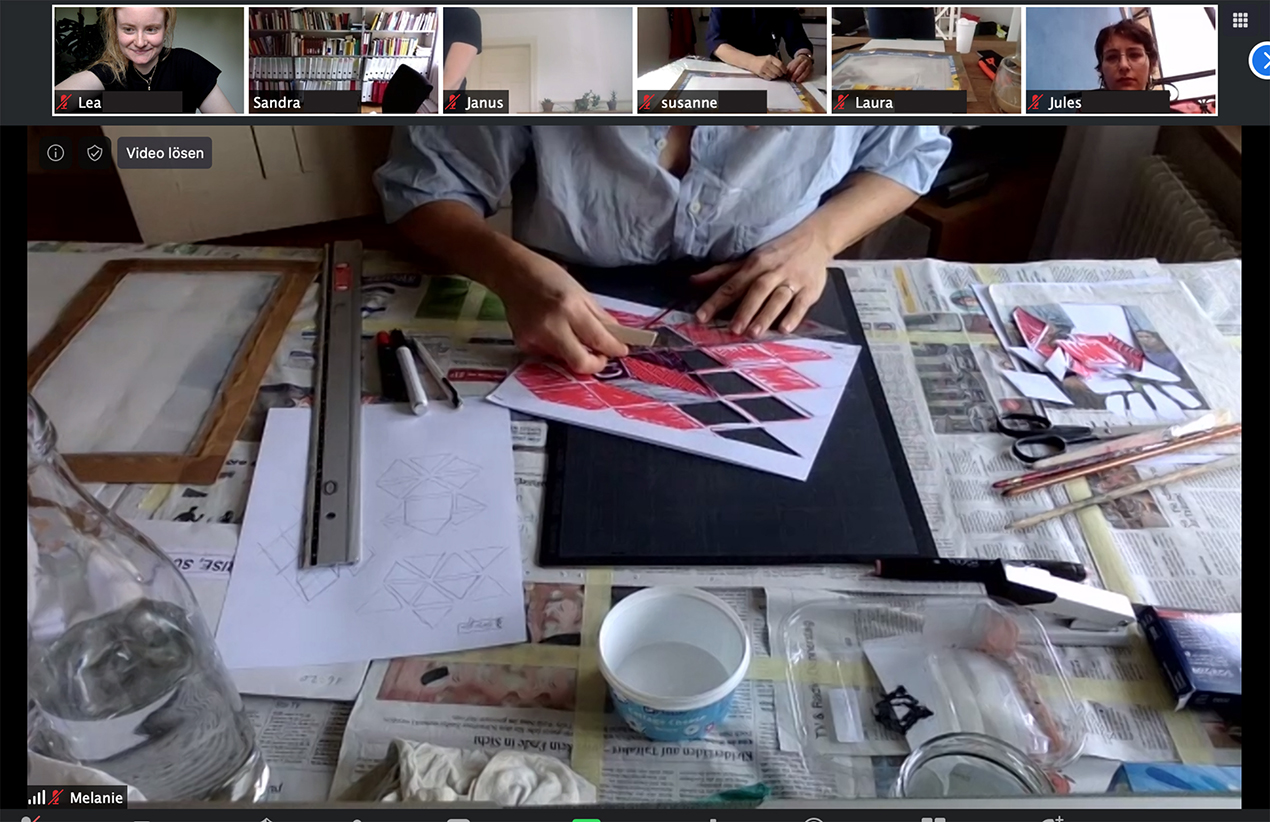 Das sich nach dem Eingangsimpuls entwickelnde, 77-minütige Gespräch kennzeichnet eine entspannte, zugewandte Atmosphäre. Alle drei Teilnehmenden Es handelt sich um die Studierenden Patrizia Steinmann, Janus Boege und Dave Koch. Ihre Namen sind im Transkript der Gruppendiskussion und im folgenden Text aus Datenschutzgründen pseudonymisiert. nutzen im Verlauf die Bildschirmfreigabefunktion und zeigen Bilder aus ihren digitalen Formaten: Sowohl Steve als auch Enno bauten ihre jeweils mit einer Tandempartnerin geplanten Druckkurse in synchrone digitale dreistündige Vermittlungsworkshops um (siehe Abb. 2 und 3). Bei beiden wurde den Kursteilnehmenden vorab Material und Werkzeug per Post zugestellt. Tamara konnte noch zwei Workshops statt einer ursprünglich geplanten grösseren Workshop-Reihe mit Teilnehmenden vor Ort im Museum durchführen. Zusätzlich erstellte sie gemeinsam mit ihrer Tandempartnerin drei Online-Videos mit DIY-Angeboten und eine Mitmachaktion zur aktuellen Ausstellung.