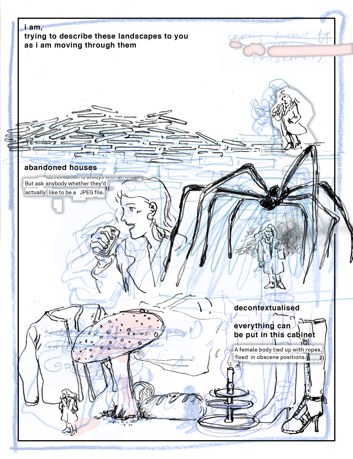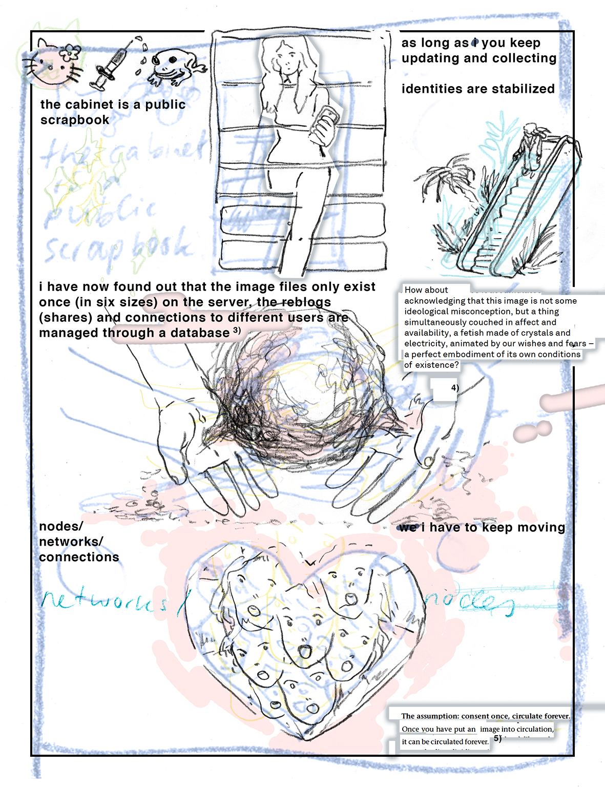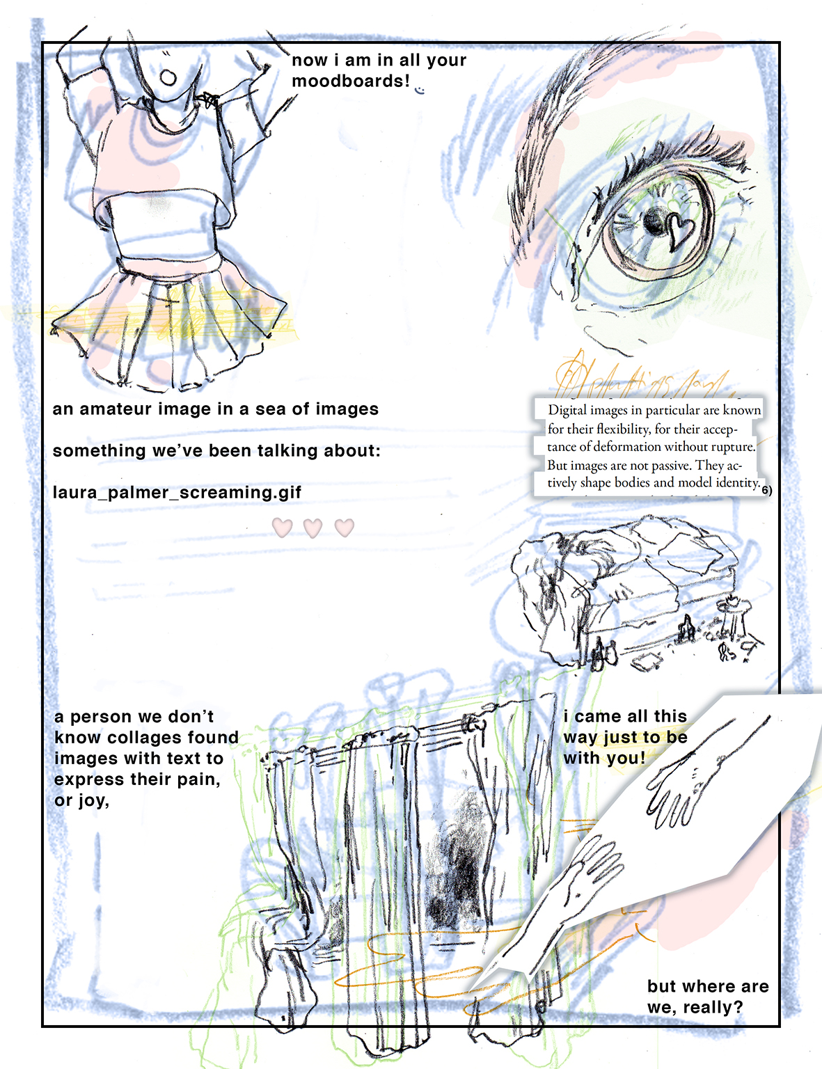 Building on the argument Heather Warren-Crow puts forth in her book Girlhood and the Plastic Image, digital images on the Internet can be thought of as girlish: These plastic images are malleable, fluid, and can easily be enlarged or shrunk down as they circulate in the network. The tumblr-specific mode of archiving and curating digital images is exemplary of this relationship: Images are decontextualized, flattened, removed from their material conditions of production, while at the same time being assigned value as purely aesthetic image-objects in a collection. The meta-comic journey through :) stages an attempt at making contact with the image-collecting tumblr users and the images circulating through the network.